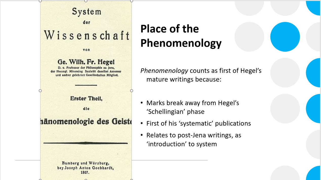 On 8 October, Robert introduced Hegel's aim and method in the Phenomenology with a lecture on Hegel's Ethics and Social Thought in the Phenomenology of Spirit. He argues that the Phenomenology of Spirit has three aims: 1. where does the Phenomenology of Spirit fit into the whole of Hegel's work; 2. the question of the relationship between philosophy and system; 3. for polemical purposes: against the anti-rationalists represented by Jacobi and the rationalists represented by Schelling. The approach of this book is, to begin with, the simplest position - perceptual certainty - and to proceed from within it as the simplest account of the way we are aware of the world and to move on from this base.