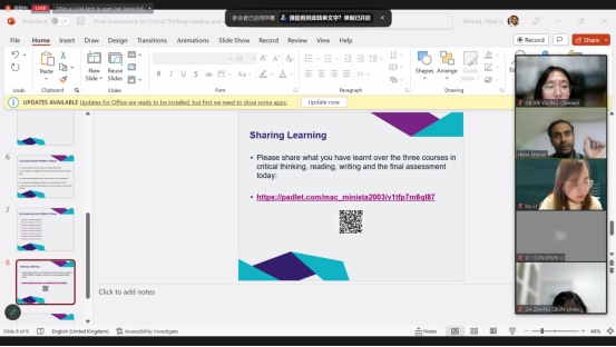 I would like to introduce what impressed me most. Firstly, as we were learning what critical thinking is, we recognized some dilemmas. When we respect others, do we need to clarify which is right and ultimately decide which is applicable? But the definition of what is right is tied to something more than critical thinking. When we get into some arguments, we need time to study them. But an argument or some questions that need an answer doesn't wait. How can we use critical thinking to discuss and work more effectively? There is a paradox that we must confront and ponder for a long time. Secondly, the work is supported by various techniques and tools. We learned various platforms for article searching, article assessment, article correction, and article submission. For preparing the article, the questionnaire platforms abroad were introduced. To present our work or others, we got some useful websites that could help us practice our presentations by ourselves. Thirdly, by communicating with team members at each stage, we summarized our probable problems and integrated beneficial measures. It's also amazing to break the limits of perspective and learn thinking methods from different disciplines.