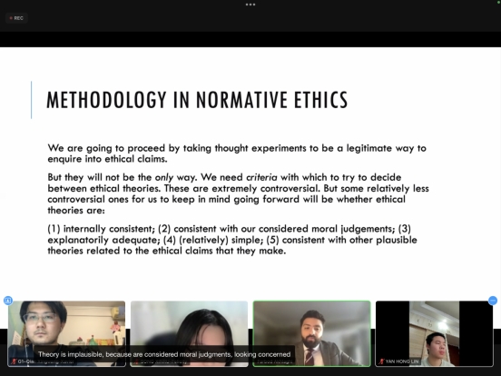 The biggest harvest of this course is to make me realize the similarities and differences between Chinese and foreign philosophy teaching and scientific research directions and ideas - I asked the teacher in the class some different contents from the project lectures in the ethics teaching of our school, which also made me deeply realize the importance of Professor Jin Yunfeng's teaching of "learning foreign philosophy research methods"; In addition, I have exercised my English communication ability and listening ability, and mastered more academic English vocabulary; At the same time, it also made me have a further understanding of ethics and formed a good habit of reading foreign literature.