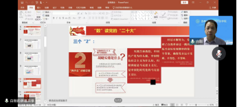 接着,白刚教授从二十大报告中梳理总结出“两个‘1’”、“三个‘2’”、“三个‘3’”,并向同学们重点讲述了党从现在起的中心任务和第一要务以及党全面建成社会主义现代化强国的“两步走”战略安排,指出了新征程上全体党员要做到的“三个务必”,强调了十年来党和人民事业具有重大现实意义和深远历史意义的三件大事:一是迎来中国共产党成立一百周年,二是中国特色社会主义进入新时代,三是完成脱贫攻坚、全面建成小康社会的历史任务,实现第一个百年奋斗目标。