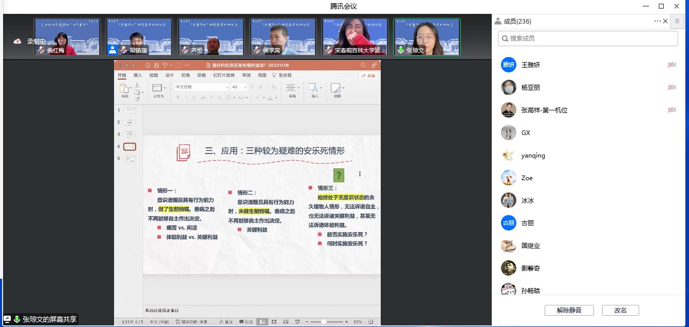 宋春莉教授对以上六位同学的发言表示肯定,并从临床实践经历进行了分享。侯学宾教授从权利与义务的角度出发,阐述了“临终关怀”问题中的法理困境。芦恒教授向同学们讲解了现代医疗体系中的宁养院机构与社会工作机构,展示了各类医务社工的临终关怀方法。张彦彦教授对研究生跨学科研讨的组织形式提出了构想,并期待疫情结束后在线下进行更加深入的沟通与互动。曲红梅教授在总结发言时再次指出伦理学科在学科交叉科研中的重要地位,期待后续与各学科有更进一步的交流互动。