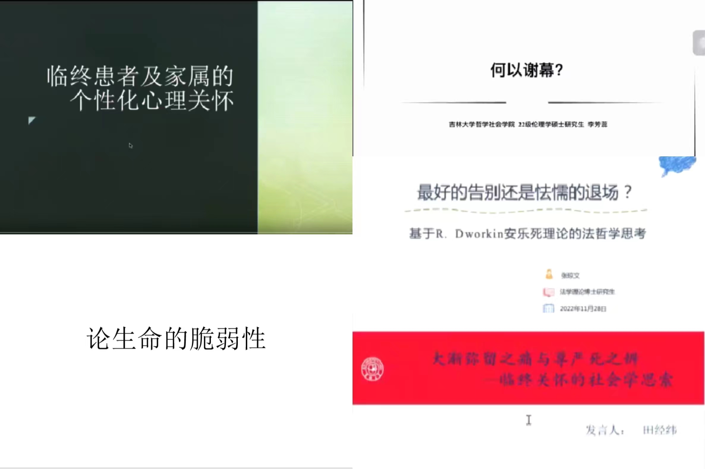 在发言中,来自白求恩第二临床医学院的白宇同学提倡将传统的“生物医学模式”转变为“叙事医学模式”,贯彻医学人文精神以维护生命尊严。社会心理学博士研究生王虹予详细介绍了“临终关怀”理论与实践的起源与发展,认为“临终关怀”在面向患者的同时也要保持对患者家属的关切。法理学博士研究生张琼文反驳了用“投入-浪费”理论衡量生命价值的方式,点明在生死问题上应当尊重主体的“关键利益”。伦理学硕士研究生李芳蕊揭示了“临终关怀”实践中的三大困境,提出应当以人为核心构建“临终关怀”的理论与实践体系。社会学博士研究生田经纬分享了社会学研究中关于“已死-濒死”的讨论,着重介绍了“安宁疗护”社会工作的价值。伦理学博士研究生王宝锋认为可以用面向生命“脆弱性”的研究方法代替传统研究中面向生命“独特性”的方法,并阐明了生命脆弱性的本质与三种脆弱性类型。