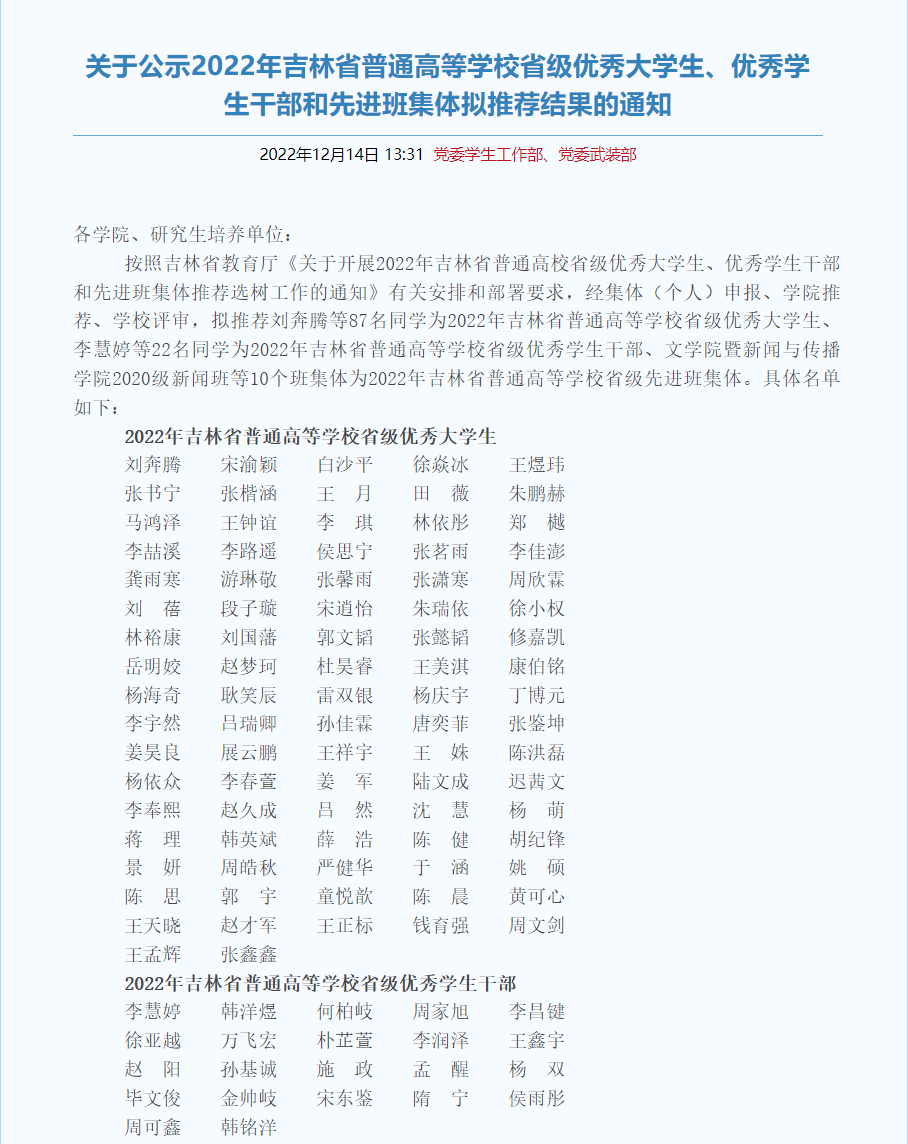 近日,根据吉林省教育厅《关于开展2022年吉林省普通高校省级优秀大学生、优秀学生干部和先进班集体推荐选树工作的通知》有关安排和部署要求,经集体(个人)申报、学院推荐、学校评审,91国产 2019级社会学专业本科生刘奔腾同学、2020级马克思主义哲学专业博士生姜昊良同学荣获2022年吉林省普通高等学校省级优秀大学生荣誉称号;2020级劳动与社会保障专业本科生李慧婷同学荣获2022年吉林省普通高等学校省级优秀学生干部荣誉称号。