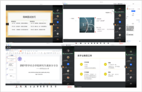 嘉宾们分别从从自身经历出发,条理清晰地向师弟师妹们分享了从求职经验、工作心得、考前准备、心态调试等方面的种种干货。线上观看就业分享会的人数近百人,前来参会的同学结合自己实际的问题对师兄师姐进行提问,优秀毕业生逐一进行解答。