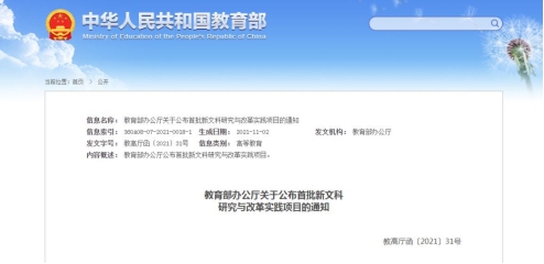 为深入学习贯彻习近平总书记关于教育的重要论述,全面推进新文科建设,构建世界水平、中国特色的文科人才培养体系,根据《教育部办公厅关于推荐新文科研究与改革实践项目的通知》要求,教育部组织开展了新文科研究与改革实践项目申报评审工作,共认定首批教育部新文科研究与改革实践项目1011个。