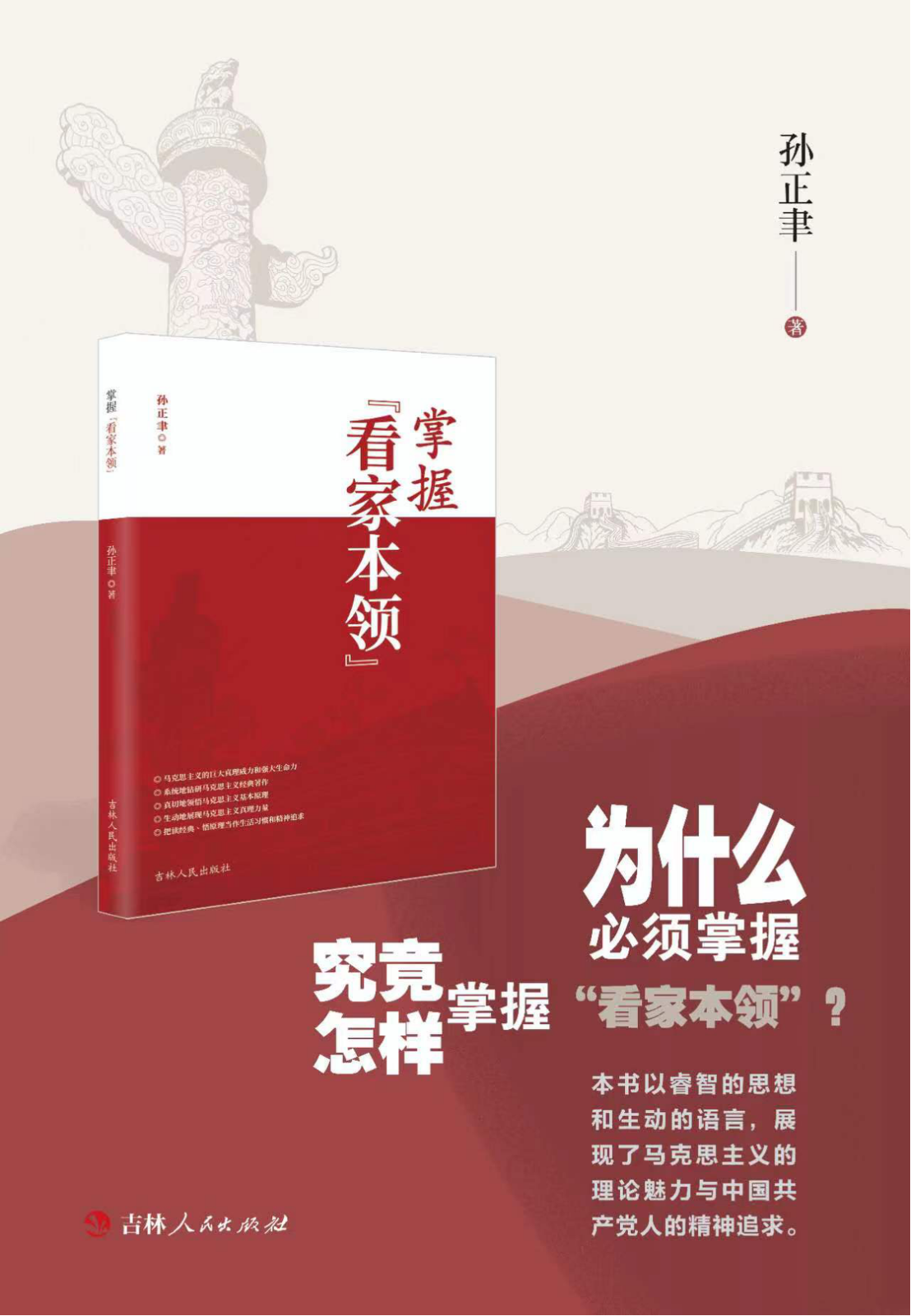 2021年,在胜利迎来中国共产党建党百年之际,应吉林人民出版社之约,孙正聿教授撰写了《掌握“看家本领”》一书。习近平总书记在中央党校建校80周年庆祝大会上的讲话中指出,“要认真学习马克思主义理论,这是我们做好一切工作的看家本领,也是领导干部必须普遍掌握的工作制胜的看家本领。”该书围绕掌握“看家本领”这个主题,针对为什么和怎么样掌握“看家本领”这两大问题,具体地阐述和回答了五个问题:一是马克思主义的巨大真理威力和强大生命力;二是系统地钻研马克思主义经典著作;三是真切地领悟马克思主义基本原理;四是生动地展现马克思主义真理力量;五是把读经典、悟原理当作生活习惯和精神追求。