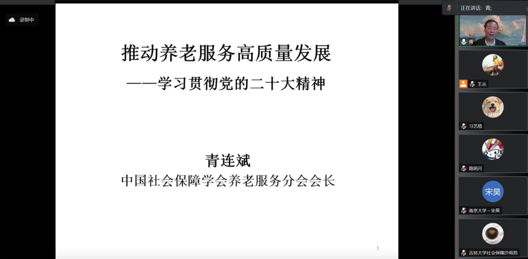 哲学社会科学学术讲座(总1130场)在线上顺利举办。本次讲座邀请了中共中央党校国家行政学院教授、博士生导师、中国社会保障学会养老服务分会会长青连斌教授为全院师生做学术讲座。讲座以“推动养老服务高质量发展——学习贯彻党的二十大精神”为主题,主持人为副院长芦恒教授。校内外师生近七十人在线参与。