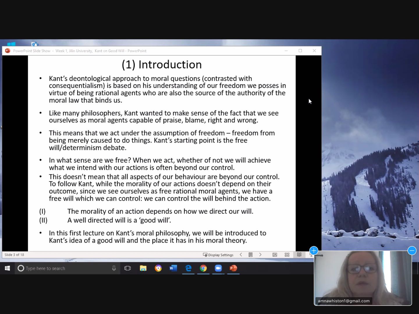 5月14日,Amna主要介绍了善良意志(good will)概念以及它在康德道德哲学中的地位。康德关于道德问题的去本体论化的(deontological)方式建立在康德对于我们人作为理性主体拥有自由这一事实的理解之上。