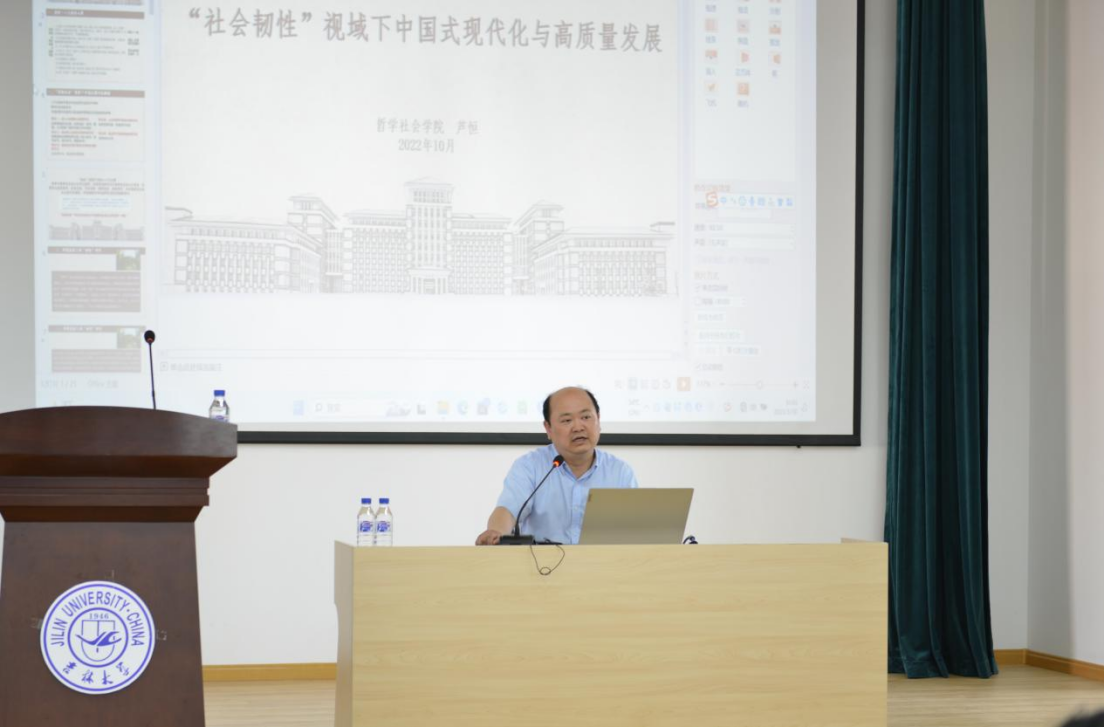 芦恒教授以《“社会韧性”视域下中国式现代化与高质量发展》为题,从风险社会背景下中国式现代化解读、学理层面的“韧性”研究、中国式现代化过程中的韧性发展三个方面为与会人员进行了精彩的讲解。他从社会科学的角度,全面分析了建设中国式现代化面临的八种风险挑战和中国式现代化的五个特点,系统阐述了中国共产党的执政韧性、中国式现代化过程中的社会韧性、中国式现代化过程中的文化韧性。