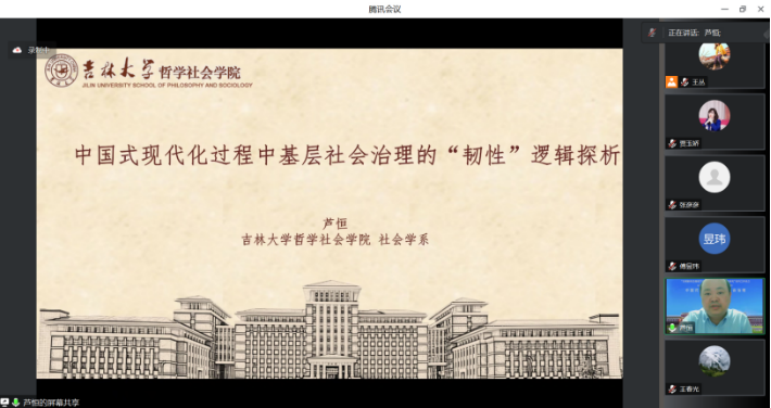 芦恒教授以《中国式现代化过程中基层社会治理的“韧性”逻辑探析》为题进行发言。芦恒教授从“韧性”的视角探索中国式现代化进程中基层社会治理的内在动力问题,详细阐述了基层社会治理与韧性的内在关联、韧性与基层治理现代化的内在契合性、基层社会治理的韧性逻辑及其基本关系等观点。