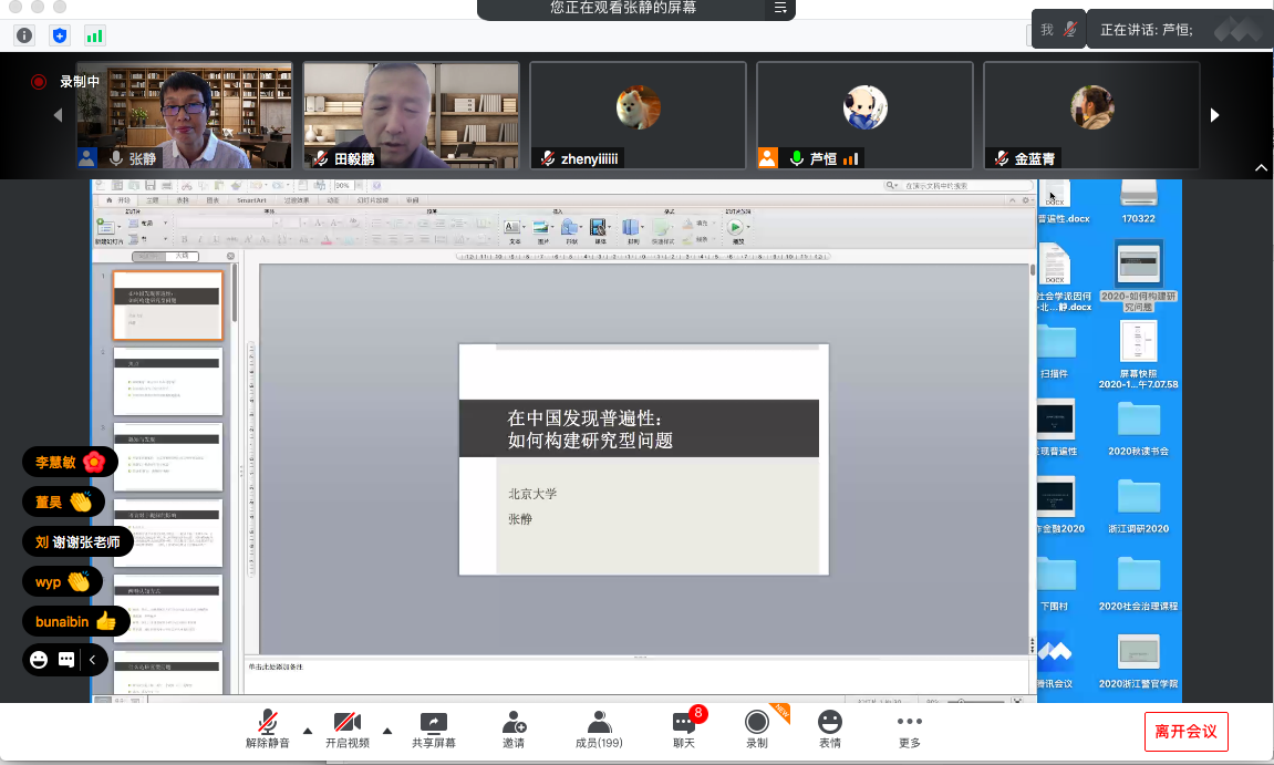 第115场名家讲座通过腾讯会议的形式在线上举办。北京大学社会科学学部主任、北京大学社会学教授、博士生导师张静教授,作了题为《如何提问·在中国发现普遍性:如何建构研究型问题》学术讲座。田毅鹏院长致开场词。