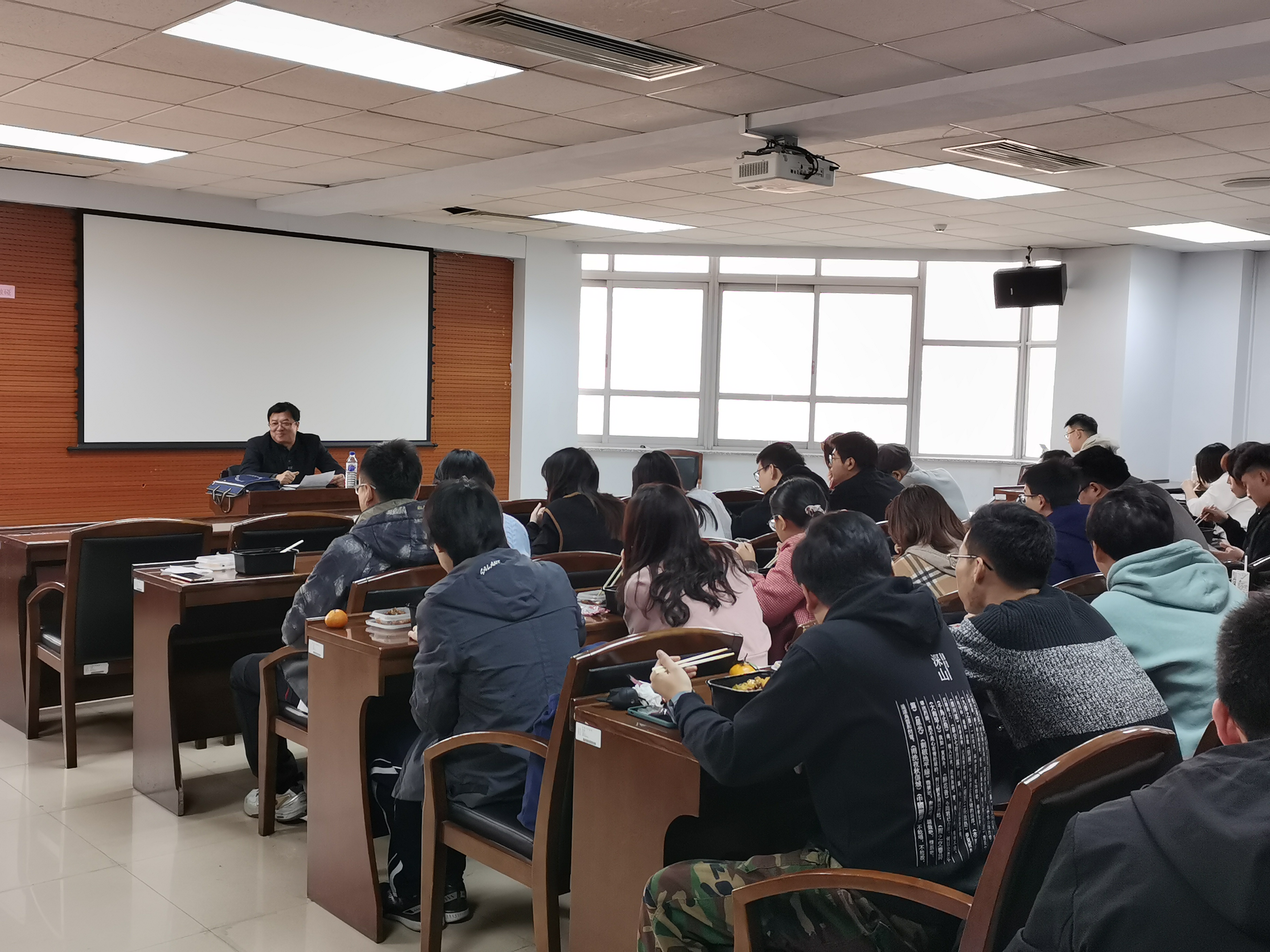 最后李海峰教授还和在场师生展开了互动讨论。李老师精彩幽默的讲话风格,使得现场气氛十分热烈。李海峰教授丰富的知识储备和多年的哲学工作经验,让同学们受益匪浅,也让大家十分期待下一次“学术月坛”活动。(张帆报导)