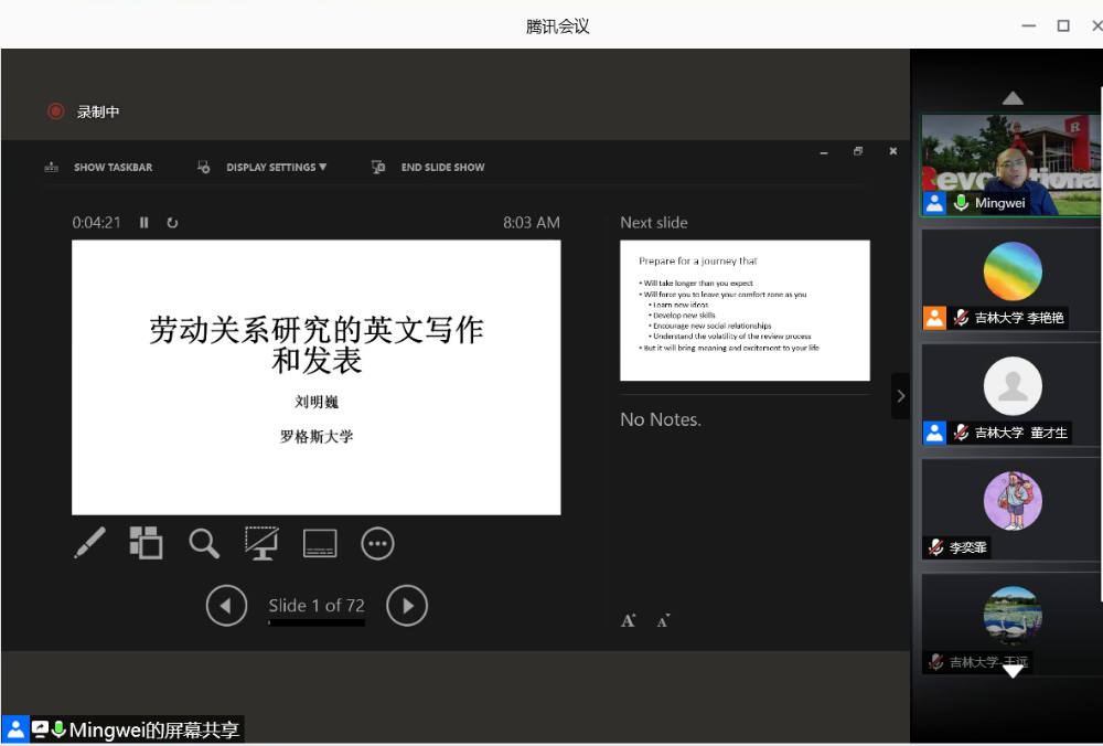 名家讲座第107场以腾讯会议的方式举行。美国罗格斯大学管理与劳动关系学院终身副教授、罗格斯-中国人民大学全球工作与雇佣中心主任刘明巍做了题为“劳动关系研究的英文写作和发表”的学术讲座。本场讲座是劳动关系系列讲座第四场,由91国产