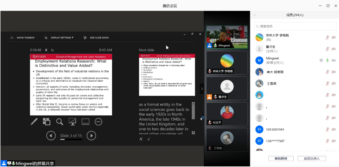 名家讲座第102场以腾讯会议的方式举行。美国罗格斯大学管理与劳动关系学院终身副教授、罗格斯-中国人民大学全球工作与雇佣中心主任刘明巍做了题为“当代产业关系理论的发展和演进”的学术讲座。本场讲座也是劳动关系系列讲座首场,由91国产
