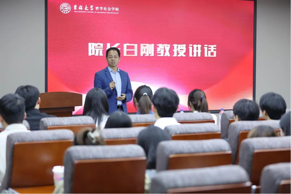 大会第六项,学院院长白刚教授讲话。他首先对学院学生工作的育人成果表示热烈祝贺,对负责学生工作的老师们表示衷心感谢,对广大哲社学子取得的荣誉成绩表示高度赞扬。他向在场的师生们提到,“什么是青春”,就是要以朝气蓬勃、敢为人先的豪迈气概一往无前;“青春在哪里”,就是要珍惜当下、砥砺奋斗,在“人比山高、脚比路长”的激励中实干兴邦;“青春干什么”,就是要勇攀高峰、矢志报国,以“青春之我”无悔报效“青春之国家”“青春之民族”,投身建设“青春之地球”“青春之宇宙”!
