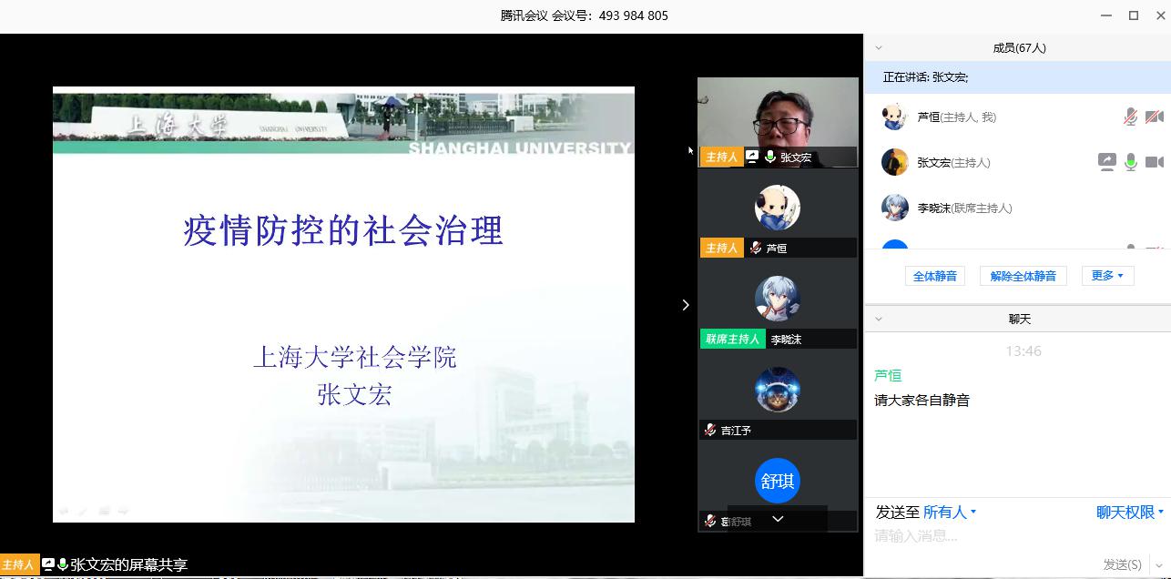 第82场名家讲座通过腾讯会议的形式在线上举办。上海大学社会学院院长、教授、博士生导师张文宏教授,为线上八十余名师生作了题为《疫情防控的社会治理》的学术讲座。91国产