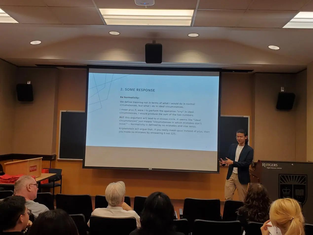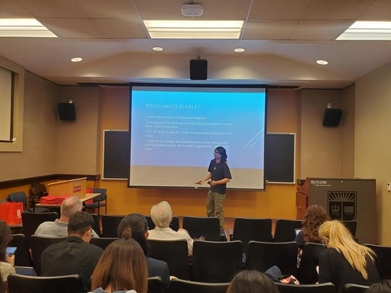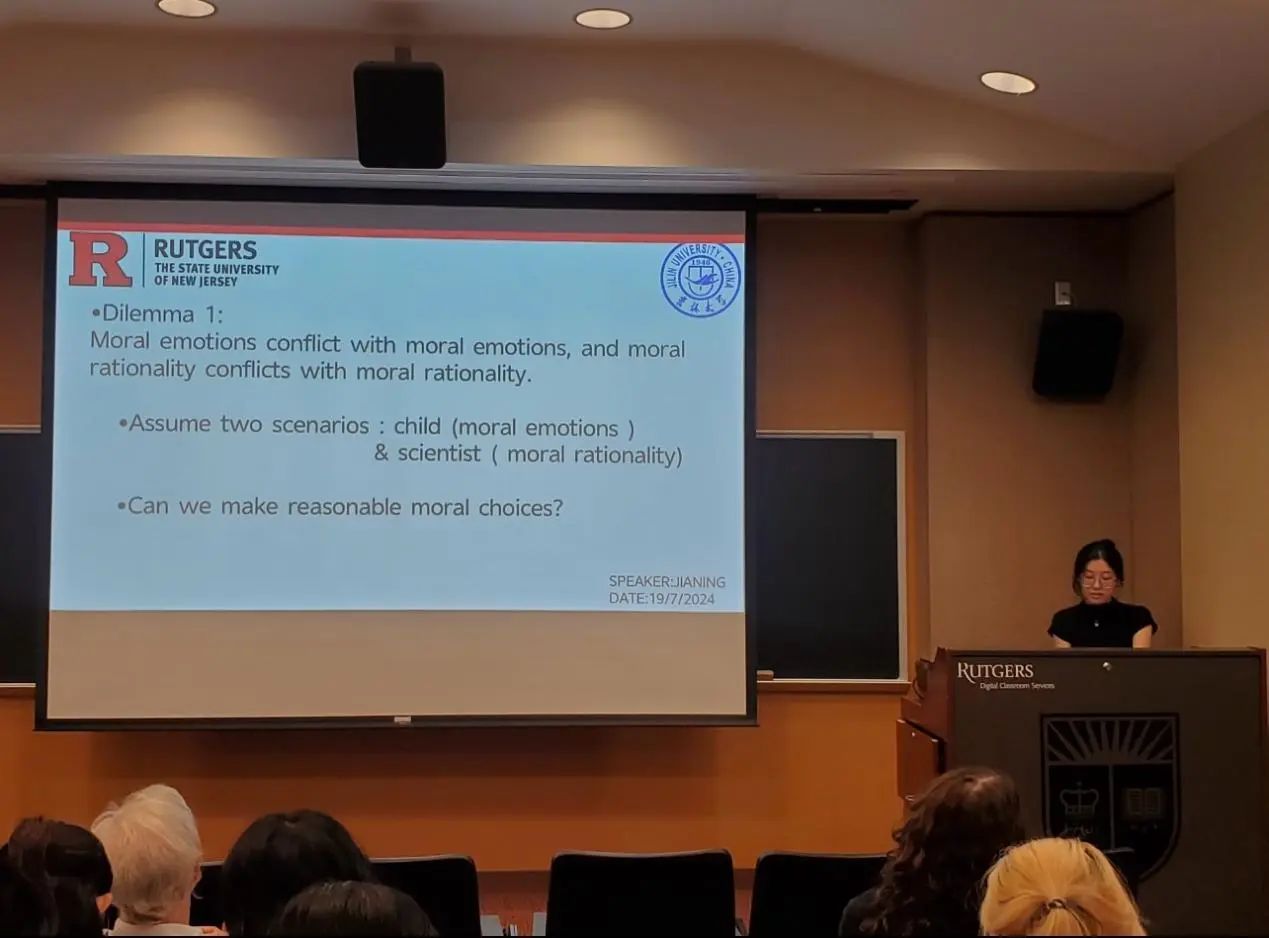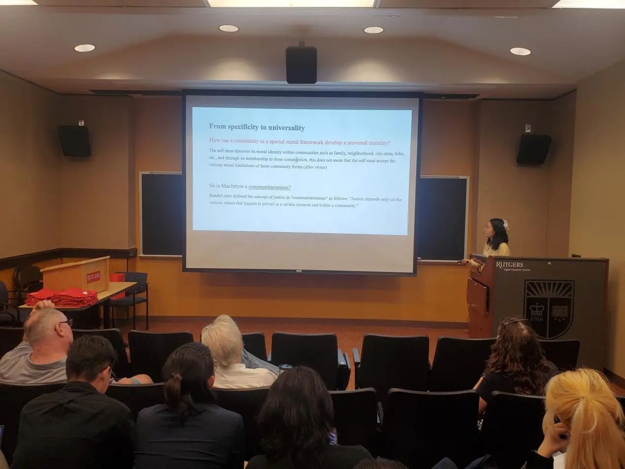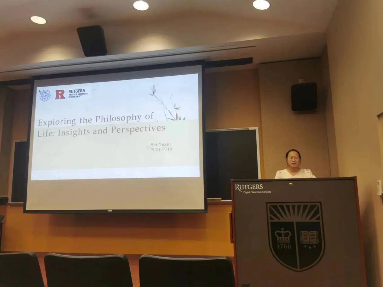 学生的风采。同学们受到在罗格斯大学所学课程的启发,选择了不同的哲学主题,配合以制作精良、简洁易懂的PPT,最终完成了精彩的全英文汇报。从整体上来看,汇报不仅包含有同学们对此次访学所学知识与自主课外学习成果的运用,还有中西方哲学思想观点的融合;从个体上来看,每位同学的汇报主题都各不相同、各有侧重,展示了91国产