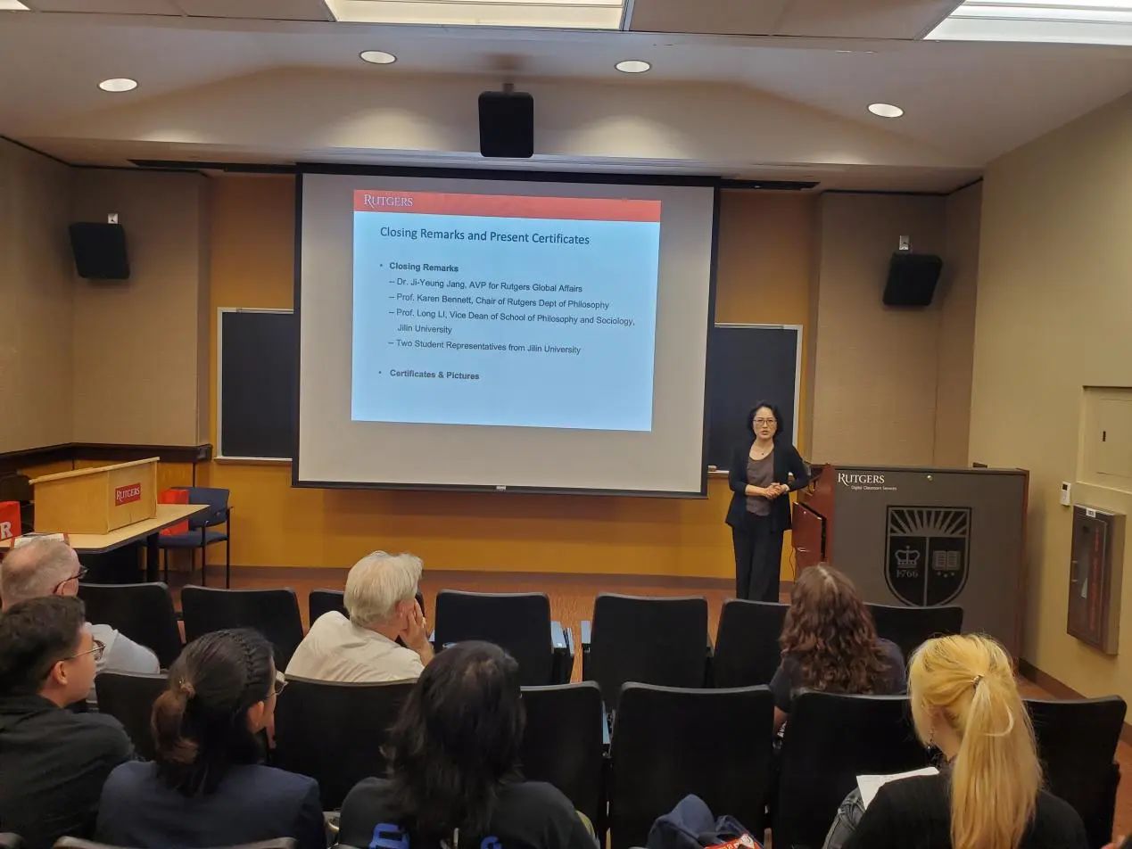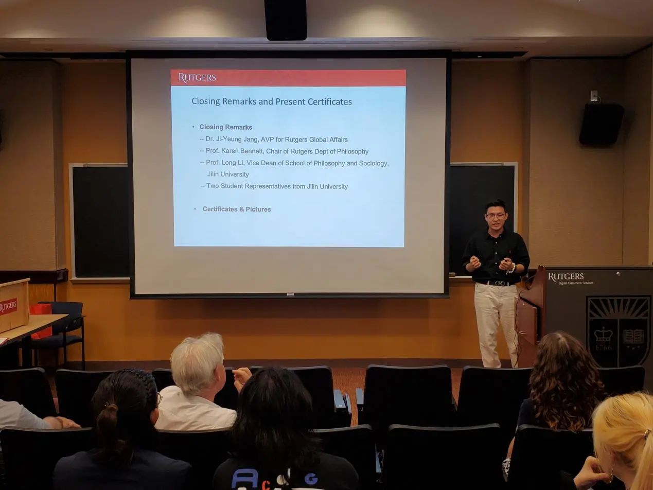 此后,两校教师、校领导发表讲话。罗格斯大学全球事务助理副校长Ji-Yeung Jang博士肯定了两校哲学学术交流的成果,表示自己对关于人生意义的哲学问题非常感兴趣,两校的哲学暑期交流活动十分有意义。