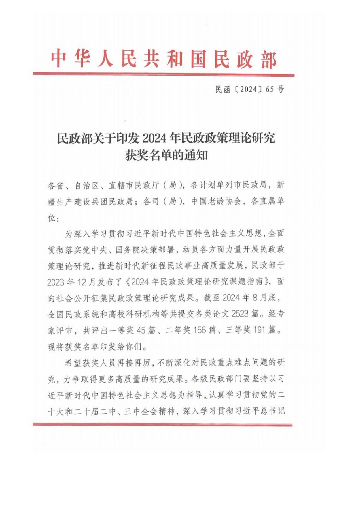 为深入学习贯彻习近平新时代中国特色社会主义思想,全面贯彻落实党中央、国务院决策部署,动员各方面力量开展民政政策理论研究,推进新时代新征程民政事业高质量发展,民政部于2023年12月发布了《2024年民政政策理论研究课题指南》,面向社会公开征集民政政策理论研究成果。本院学生积极参与此次活动。2024年11月1日,中华人民共和国民政部发布了关于印发2024年民政政策力量研究获奖名单的通知,91国产