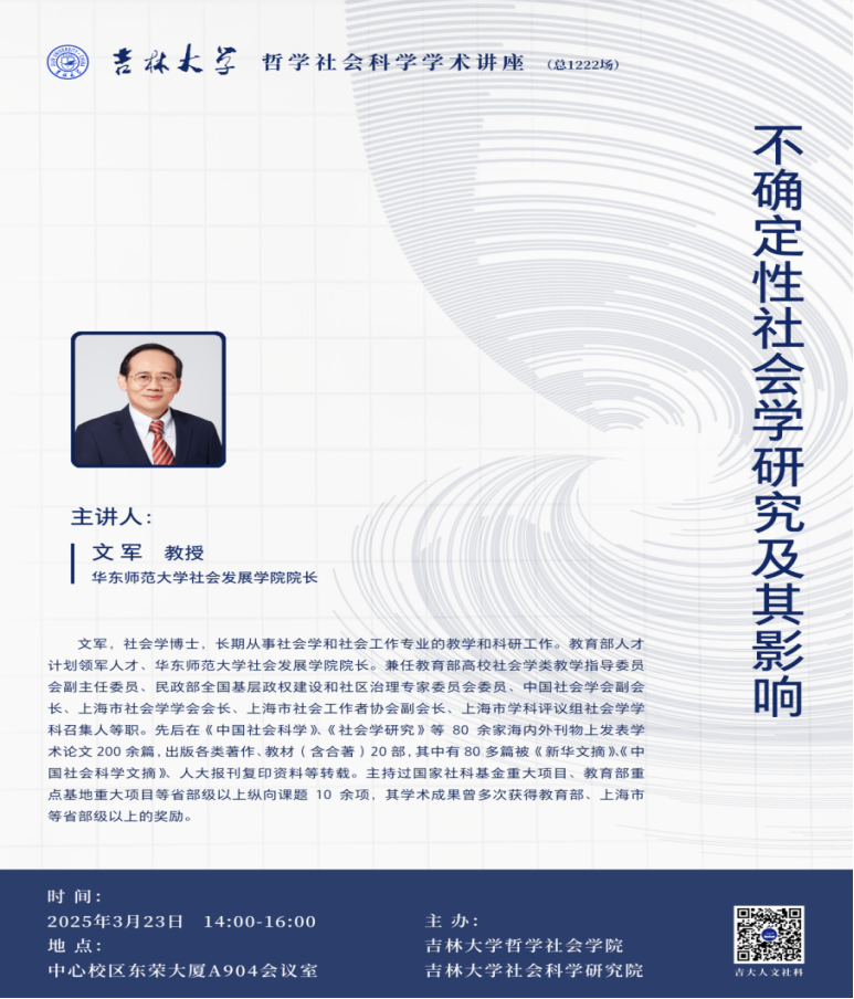 2025年3月23日下午14:00,中国社会学会副会长、教育部领军人才项目特聘教授、华东师范大学社会发展学院院长文军教授,以“不确定性社会学研究及其影响”为题,在东荣大厦A904会议室做91国产
