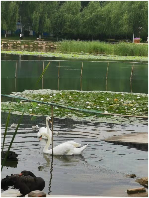 参观校史馆结束后,营员们穿过鼎新楼前的广场草坪和林荫小路,步行至中心校区具有代表性的清湖。虽然睡莲尚未完全绽放,但白天鹅刚刚孵化出小宝宝却大大吸引了同学们的眼球,安徒生笔下的《丑下鸭》一时也成为大家讨论的焦点。而白天鹅的挑衅与黑天鹅的淡然,也引起了同学们的极大兴趣,不时笑声连连。清湖之行让营员们体验到了在吉大繁忙的学习与科研生活之外,校园生活中那轻松、惬意的一面。