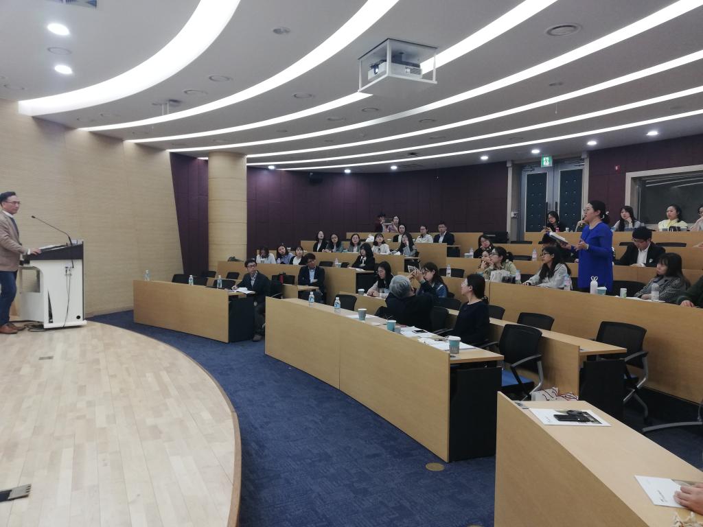 的芦恒教授与中国政治经济系主任文益俊教授共同主持了大会,两校学生分别就“网红经济”、“中韩青年就业观念”、“中韩青年的工作时间”、“中韩青年婚姻观”、“996工作制”、“中韩青年恋爱观”,以及“传统文化与文字”等问题进行分组探讨。通过此次活动,大家加深了对中韩两国的社会变迁有了深入理解。5月8日下午,交流团参加了首尔国立大学亚洲城市社会研究中心的学术报告。此次报告由人文地理系教授朴培均主任主讲。朴教授指出城市化进程中的环境问题是东亚的面临的共同的问题,应从后发展理论寻找突破口,并倡导“共享与和平”、“可持续性发展”、“韧性发展”的城市发展理念。交流团就后工业时代的城市化问题,后现代社会学理论内容与朴教授进行热烈探讨。
