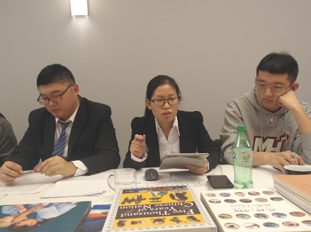 接着,荆福权同学分享了六祖惠能得禅宗衣钵的故事。惠能,一个不识文字,不通礼仪的蛮荒之人,在寺中劳作八月,之后得到了五祖认可,传与衣钵,并作出了“菩提本无树,明镜亦非台。心性常清静,何处惹尘埃。”这样义理甚深的偈语。报告中所蕴含的“人人皆有佛性”、“顿悟成佛”的大乘思想,引发在场之人的思考,对东方民族的智慧也有了更多的了解。最后,邓朵同学以佛门特有的“卍”字符号为开篇,讲述“磨砖成镜”的典故。邓朵同学对此文化典故进行了深刻的义理阐释,点出“平常心是道”的返璞归真的佛家妙理,引发了在场教师对平常心的讨论和交流。