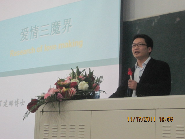 讲座当天下着雨,可是,讲座现场依然十分火爆,座无虚席,热情的学生从临近的课室搬来凳子坐在过道,甚至好多同学不得不站着听老师的讲座。老师从心理学角度专业而独到的分析,配合其精彩而风趣的讲解,更加使得爱情这个永恒的话题丰盈和深刻,同学们听得聚精会神,此起彼伏的掌声中不断有本在自习的同学加入听讲。不管是单身还是身旁已经有人的同学,这次讲座无疑让他们受益良多——爱情需要付出,也同样需要智慧。愉快的时间似乎总是过的飞快,眨眼间就过去了两个多小时。讲座结束后,同学们仍意犹未尽,很多同学留下来和老师进行了热烈的讨论,直至很晚才散去。