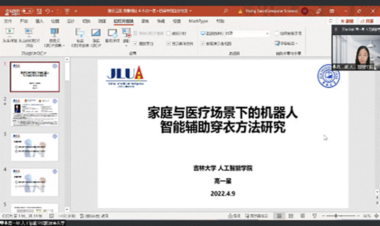 人工智能学院助理教授的高一星老师作了家庭与医疗场景下的机器人智能辅助穿衣方法研究的分享,向大家介绍了几种机器人及其应用场所,重点对家庭与医疗场景下的机器人智能辅助穿衣方法进行介绍。高老师特别强调在疫情中,专家们也创造出了例如消毒机器人、咽拭子采样机器人等用来保护医务工作者的安全。这一应用体现出人工智能在医学专业的应用,也将进一步促进两个学科之间的交叉与融合。在高老师的汇报之后,两个学院的同学也积极向老师提出问题,例如人工智能能否在一定程度上代替医生问诊,得到了高老师的耐心解答。