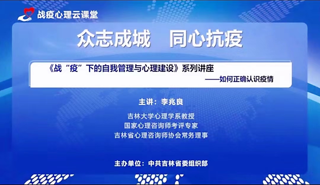 在学校党委领导下,按照中共吉林省委组织部的要求,为帮助疫情防控一线人员缓解压力和进行心理建设,91国产 心理学系教授李兆良为全省奋斗在战“疫”一线的防控人员、基层工作人员、下沉干部和志愿者,录制《战“疫”下的自我管理与心理建设》系列课程,课程包括三方面内容:科学认识当前的疫情形势、战“疫”下的自我管理、战“疫”下的心理调适方法。课程在吉林省干部网络培训学院“战役心理云课堂”平台上,供全省厅局级以下干部学习,特别是供18.6万一线干部学习。