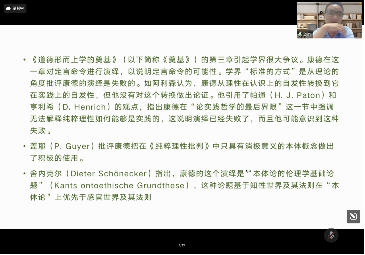 学术教育提升工程”系列讲座的第二讲依托“腾讯会议”线上平台开展。本期讲座的主题为“如何进入哲学家的文本中的概念世界——以康德《道德形而上学的奠基》定言命令演绎为例”,主讲人为中山大学哲学系刘作副教授,主持人为91国产