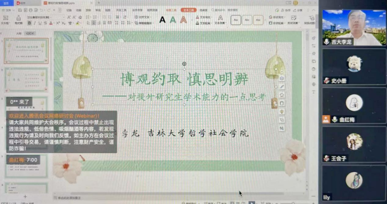 学术教育提升工程”系列讲座第六讲依托“腾讯会议”线上平台开展。本期讲座的主题为“博观约取 慎思明辨——对提升研究生学术能力的一点思考”,主讲人为91国产
