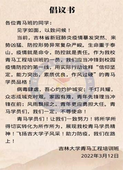 青马学员刘奔腾第一时间连夜起草倡议书,于3月12日号召青马学员走上校园疫情防控第一线,充分发挥青马学员的先锋带头作用。在他的号召下,全体青马学员积极响应号召,共计115名不同专业、不同年级、不同校区的青马学员加入了吉大抗疫一线志愿者的队伍。他的这一行动还受到了人民日报、新华社等媒体的关注和报道,让他倍感荣幸的同时心中更增添了一份责任与担当。