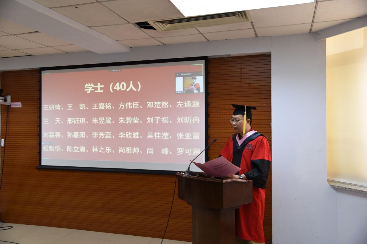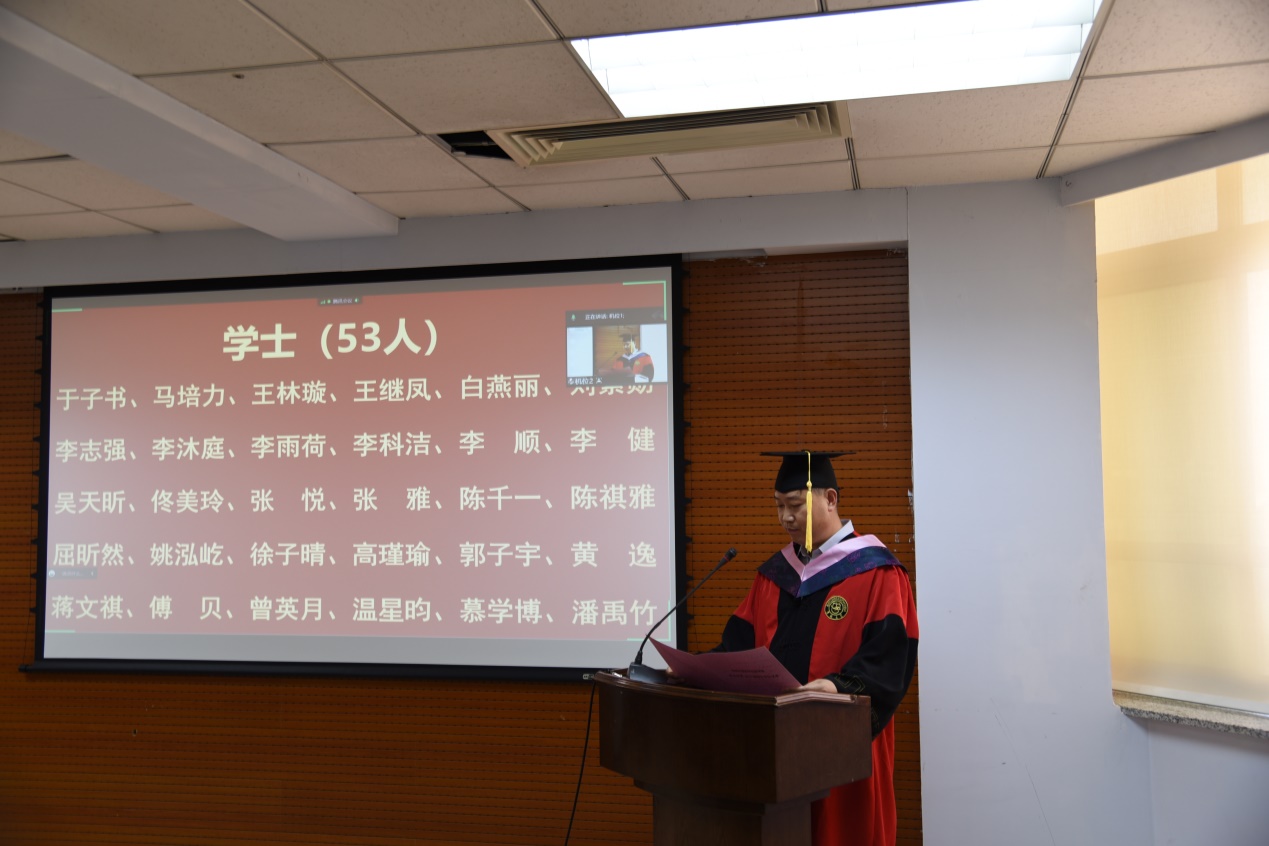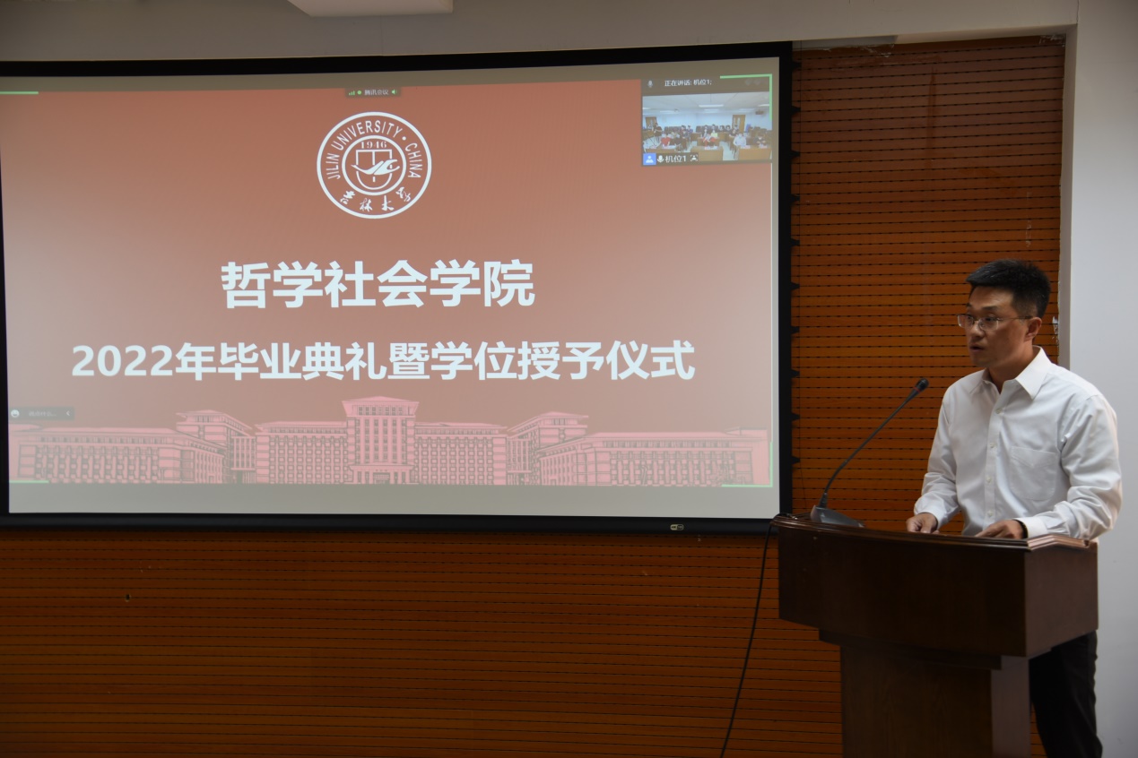 院长田毅鹏、党委副书记赵洁、党委副书记兼副院长刘培强、副院长曲红梅、副院长芦恒、副院长王福生、哲学系副系主任高超、社会学系主任董运生、心理学系主任张彦彦、劳动与社会保障系主任董才生、学院教师代表社会学系教工党支部书记吴海琳,以及部分毕业生代表现场参加了典礼。同时,部分教师、全体毕业生通过线上会议的方式参加了典礼。典礼由学院党委副书记兼副院长刘培强主持。