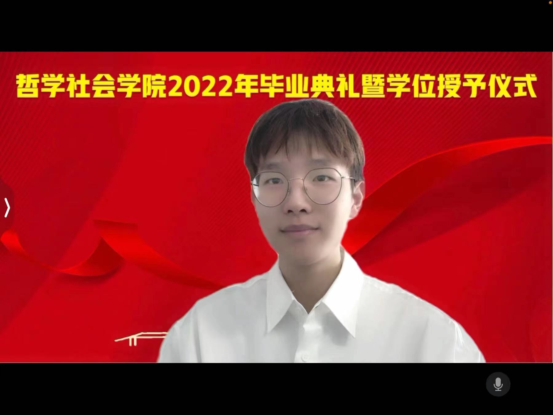 接着,毕业本科生代表刘昕冉同学发言。他提到,身为人文社科领域的学生,务必做到“为人为学,其道一也”,作为迈向学术殿堂、走出境域国门、步入社会职场的毕业生,只要用心浇灌,这片土地上终会树冠成荫、硕果充盈,也会发现自己眼眸清澈、内心有光,终能抵达各自心中的彼方。