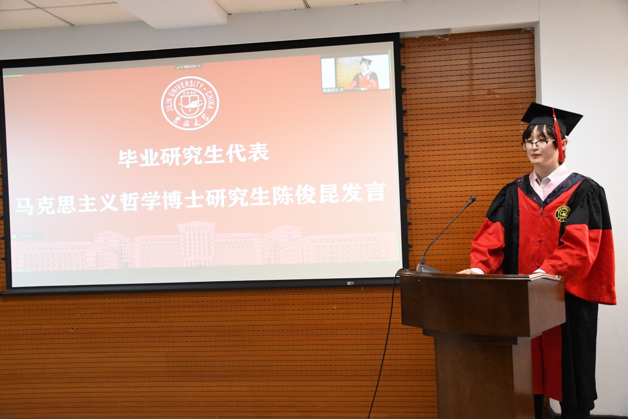 典礼第三项,学生代表发言。首先,毕业研究生代表陈俊昆同学发言。“一日归属吉大,一生念念不忘,”他说,“虽然此刻我们满怀毕业的激动和喜悦,但作为一名吉大人,一名哲社人,无论我们身在何方,无论我们相约何时,都请记得自己的身份。取得的成就,记得常与母校分享。”
