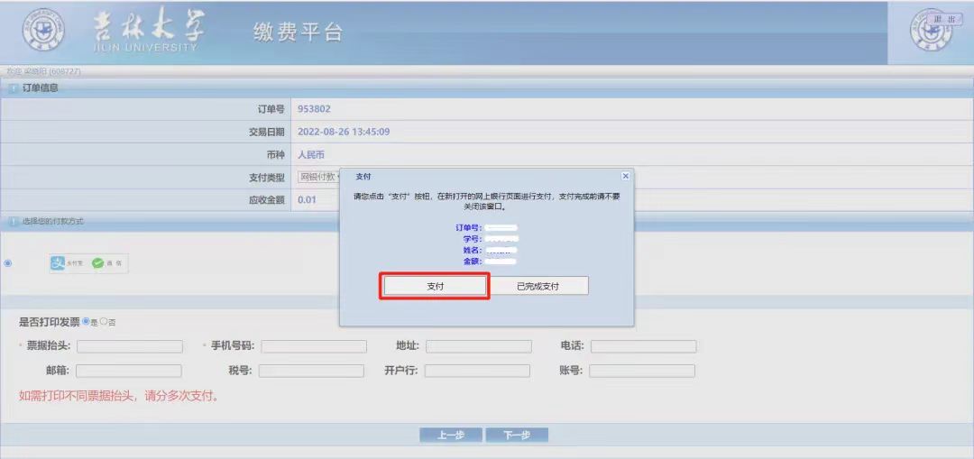 进入缴费页面,请仔细核对用户名称、缴费项目、本次支付金额,确认无误后勾选缴费项目,点击“支付”。