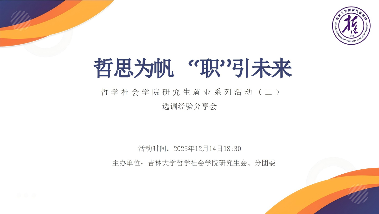 于2025年12月14日18:30组织开展“以哲思为帆·引航职业未来”就业指导系列活动之选调经验线上分享会,旨在帮助学生提升求职能力、掌握升学信息、增强就业优势。活动邀请三位已成功通过选调的优秀硕士毕业生进行经验分享。