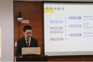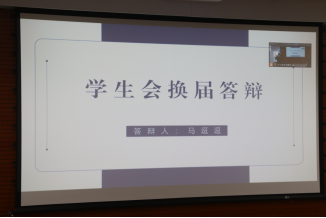 首先,刘奔腾同学介绍了参与本次答辩工作的各位老师和学生干部同学,提到本次换届答辩会是积极响应和践行党的二十大精神和习近平总书记关于青年工作的重要论述所召开的一次十分重要的会议。