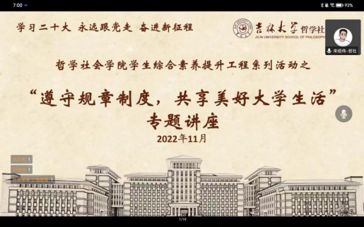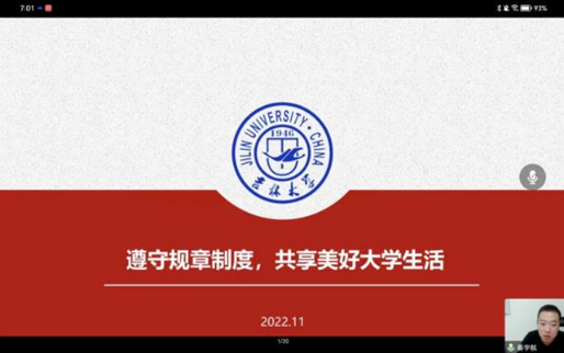 首先,姜宇航老师以“遵守规章制度,共享美好大学生活”为题,以丰富详实的案例,向同学们宣讲了校园生活中可能存在的违规违纪事件类别,并就典型事件向同学们做出警示。姜老师提醒同学们要严格遵守校规校纪,在纷繁复杂的社会生活中辨析是非,做到既守住“底线”,又不触碰“红线”,享受美好的大学生活,追逐光明前程。