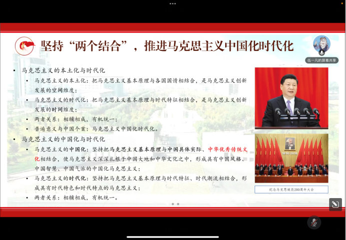 接着,伍一凡同学就党的二十大精神学习体会与同学们进行分享。新时代的十年里取得了举世瞩目的成就,全面建成小康社会、完善中国特色社会主义制度,推进国家治理体系和治理能力的改革,这些巨大成就让人民过上了好日子,让社会愈加的和谐,让国家愈发的强盛。中国共产党之所以行、中国特色社会主义为什么好,归根到底是马克思主义行,是中国化时代化的马克思主义行,二者的结合从不是机械的结合,而是有机的结合、是辩证的结合。