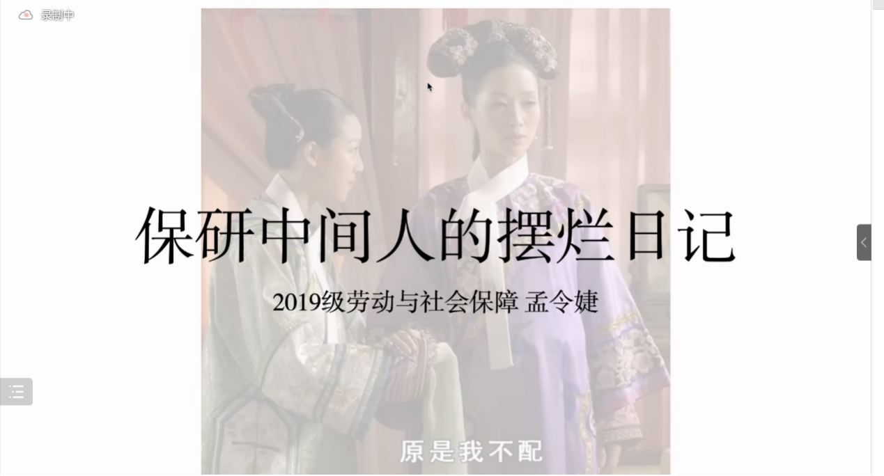 劳动与社会保障专业的孟令婕师姐则以幽默的语气分享了 “保研中间人的摆烂日记”。师姐从自身心路历程出发,着重分析了目标院校选择的学业、生活、就业等多方位影响因素以及如何找到最适合自己的院校。除此之外,师姐强调了信息资源的重要性,并介绍了多个获取保研相关信息的渠道。