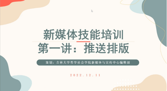 2022年12月11日下午,学生综合素养提升工程系列活动之(十)新媒体与宣传中心技能培训会第四场——推送排版制作在线上举行。本次培训由新媒体与宣传中心编辑部负责人高扬同学主讲,学院21、22级本科生同学新媒体成员共同参与了本次培训。