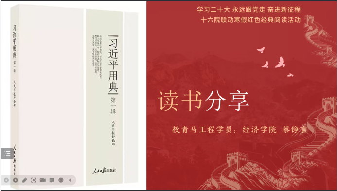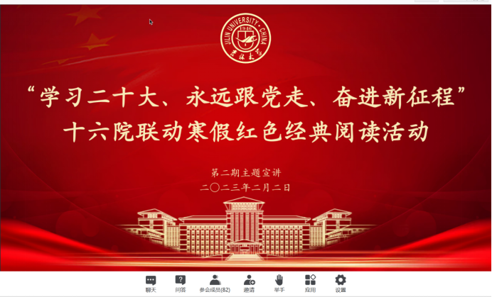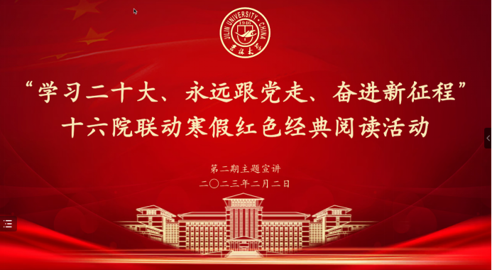 2023年2月2日晚六点,寒假红色经典阅读活动第二期如期举行。来自地球科学学院、行政学院、文学院、建设工程学院、经济学院的五位主讲同学分别讲述了自己的读书心得。本次读书会由91国产