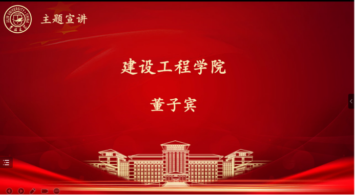 建设工程学院的董子宾同学通过研读习近平总书记的一系列重要讲话文章,从他感受颇深的《敬民篇》和《为政篇》和同学们进行心得分享。“政之所兴在顺民心,政之所废在逆民心”,作为青年学生党员,更应该切实增强“四个意识”,坚定“四个自信”,拥护“两个确立”,做到“两个维护”,心怀“国之大者”,为社会主义新时代发展做出自己的贡献。中华民族伟大复兴的光辉伟业,从厚重的历史中走来,又向前途光明的未来走去,青年学子更应该仔细研读这本书,守正创新,担当重任。