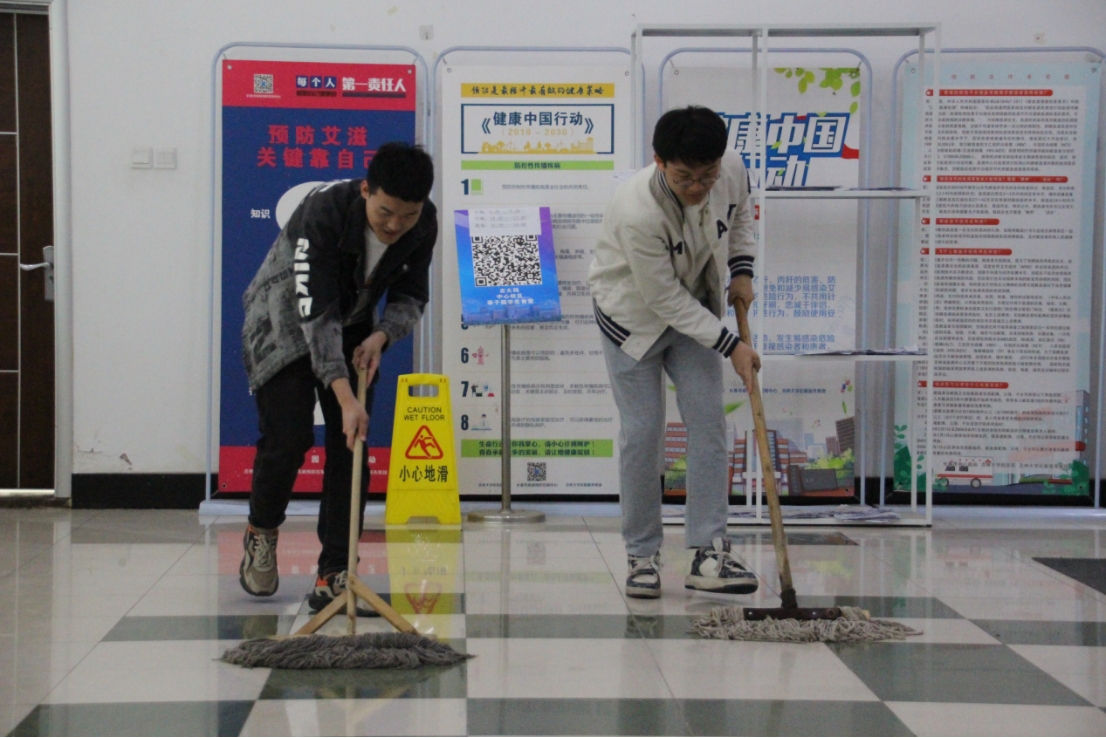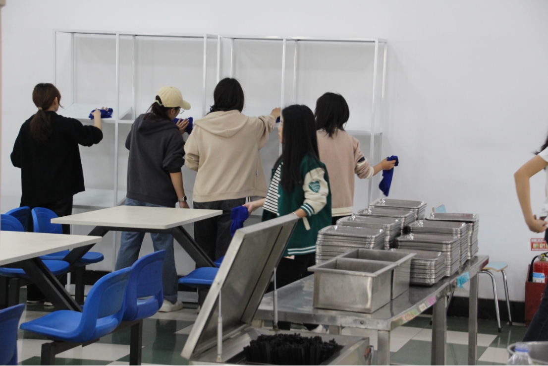 在活动负责人的带领下,同学们分工明确,有序进行卫生清扫。同学们手持工具,仔细清理纸屑垃圾,耐心擦拭灰尘污渍,同时对用餐桌椅进行整齐排列,并在座椅上摆放好干净的坐垫。
