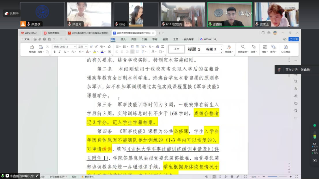 2024级新生辅导员张鑫鹏老师带领同学们详细讲解了军训规则与成绩评定,特别强调了军训的重要性以及军事技能考核的等级划分等问题。并提醒同学们,军训期间要严格遵守纪律,务必注意学时要求等相关事宜。与此同时,张老师还和同学们强调了大学生日常行为规范与纪律要求,并鼓励同学们要与老师多沟通多交流,一起解决学习生活中的问题。最后,张老师叮嘱同学们大学是人生的关键时期,希望大家珍惜时间,携手度过学习、收获、成长的大学时光。