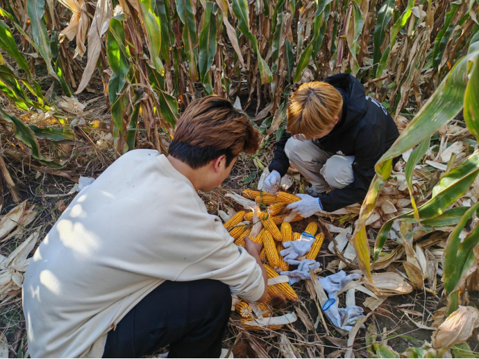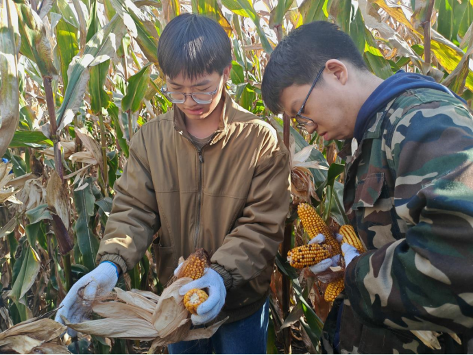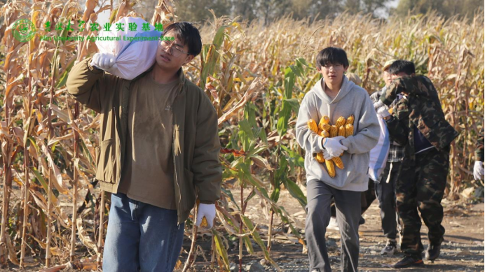 到达实践基地后,农业基地的相关负责教师引导同学们前往了自主研发品种试验田,并详细介绍了玉米、地瓜、花生等作物的生长过程,培育要点以及采摘方法。同学们认真聆听讲解,在做好劳动保护措施后分工明确,有条不紊地投入到了收获实践中。