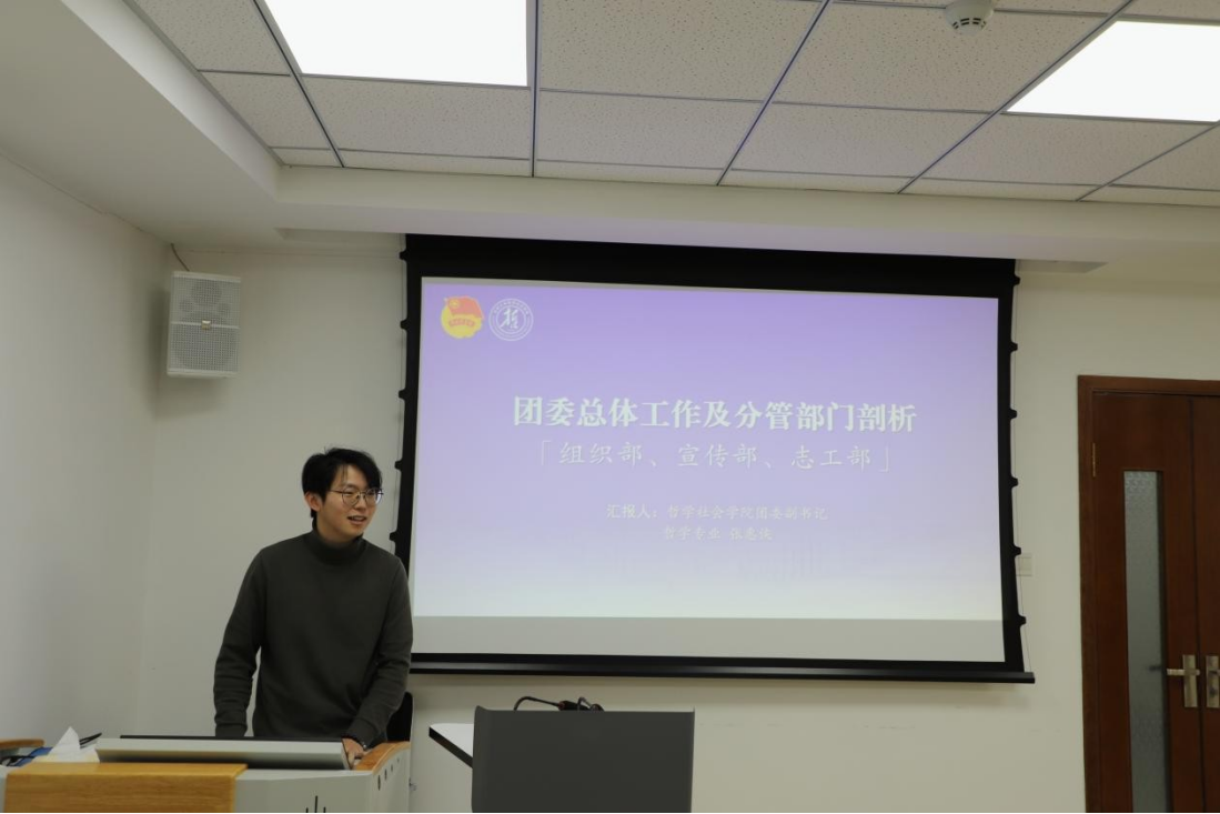 朱大卫老师在认真听取同学们的总结汇报后,首先对学院各学生组织的建设发展以及现阶段工作情况表示高度肯定。他提到,学院团委、学生会、新媒体与宣传中心聚焦“跟随大先生,追求、践行和传播真善美”思想主线,基本形成共具哲社特色又各有自身风格的工作架构,为学院育人育才工作做出了青年学子的应有贡献,对同学们在学习和工作中取得的优异成绩表示衷心赞赏。