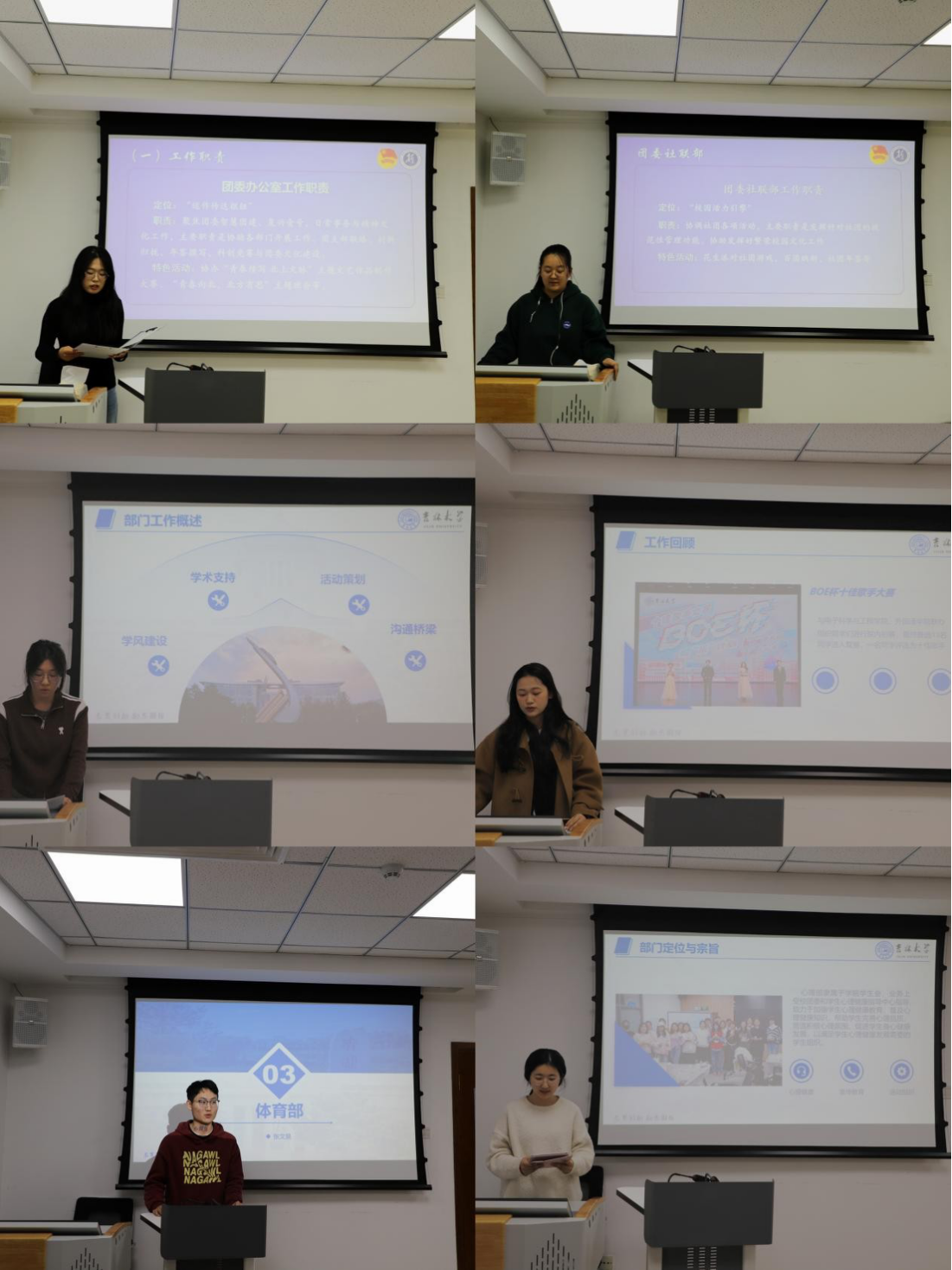 首先,来自学院团委、学生会、新媒体与宣传中心的学生组织负责人同学们围绕各组织整体情况以及具体部门的核心职能、特色工作进行汇报说明,与此同时,着重围绕目前工作面临的挑战,积极寻求学院领导老师帮助,最后对学生组织的未来发展规划进行阐述讲解。